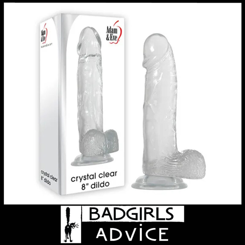 Dish out delight with this dazzling dick! Long, thick and flexible dildo has nothing to hide with crystal-clear shaft and balls. Suction cup base holds it to any flat surface for hands-free play and easy riding. With a magnificently realistic penis tip and stimulating vein textures, everything about this toy is playful, fun and deeply satisfying! Clean up with Adam & Eve toy cleaner and a warm rinse.