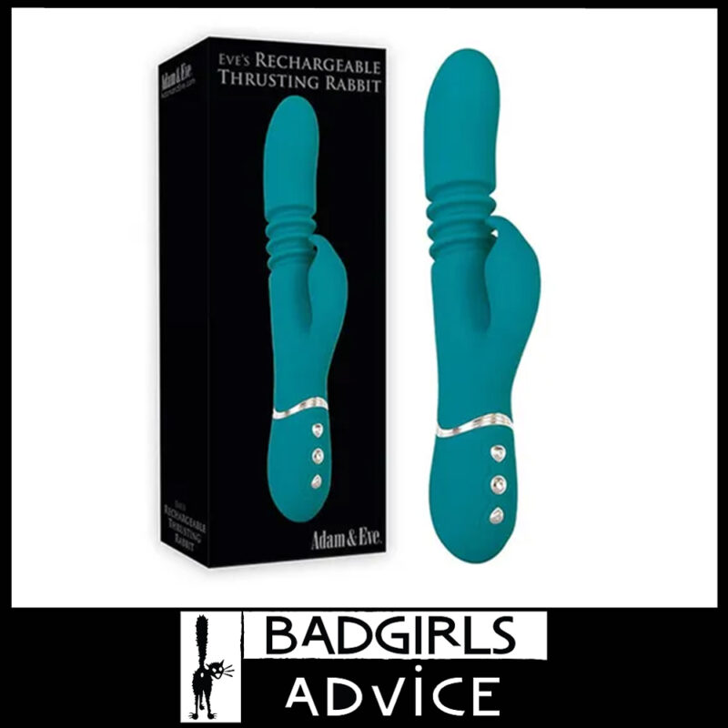 Let this rechargeable bunny’s powerful thrusts and vibrations take you over the edge! Its luxurious silicone shaft delivers 10 functions of thrust deep inside you – to satisfy your G-spot just like the real thing. Dual vibrating motors in the tip of the shaft and the clitoral stimulator buzz your hot spots with 10 functions of pulse-racing pleasure. Independent controls let you mix, match, or even isolate thrusting and vibration for the perfect orgasmic sensations. Completely submersible for underwater fun. Clean up is easy with Adam & Eve toy cleaner and a warm water rinse.