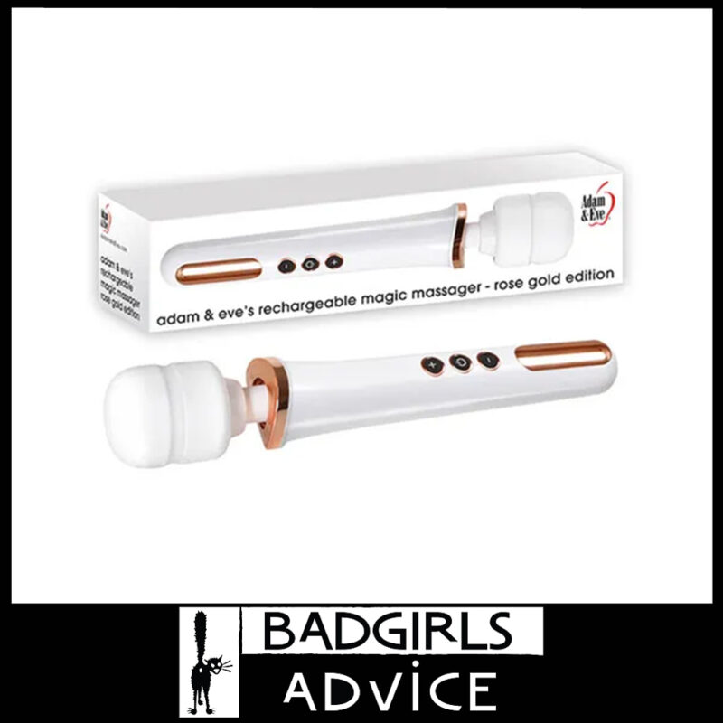 Make your next play session magical with this extra-powerful rechargeable massager with rose gold detail. Go on an adventure of pure pleasure with 10 unique vibration functions. And each function comes with 5 levels of intensity, so you can adjust the strength of each until sensations are perfect. Feel every bit of that power centered in the luxuriously smooth silicone head. Its flexible neck lets you find the perfect play position every time. It even comes with its own stylish storage bag! Clean up with Adam & Eve Toy Cleaner and a warm water rinse.