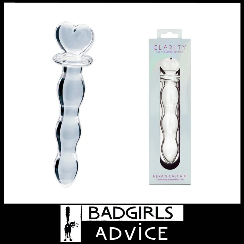 Hera’s Cascade is a 15 cm (5.9-inch) glass dildo with a sculptural heart-shaped handle, designed for elegance, control, and deeply satisfying stimulation.