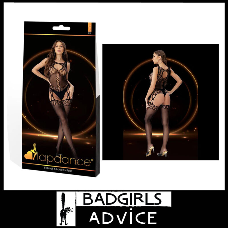 The Lapdance Lingerie fishnet and lace catsuit is an irresistibly sultry one-piece crafted from a sleek blend of nylon and spandex for a flawless, curve-hugging fit. This black catsuit features a mesmerizing mix of varying fishnet and lace patterns, combining elegance with edginess. A daring circular opening at the top adds an extra touch of allure, drawing attention to the neckline. Almost fully see-through, this design embraces bold sensuality, making it perfect for creating an unforgettable impression.