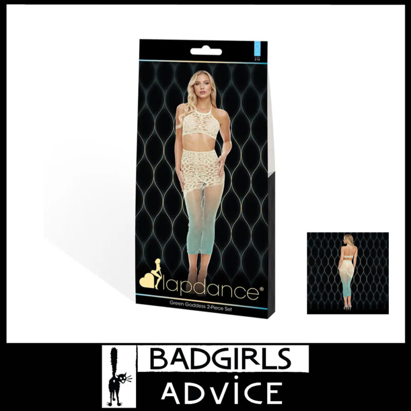 Turn heads and command attention in the stunning Green Goddess 2-Piece Set by Lapdance Lingerie. This eye-catching ensemble includes a sultry halter-style crop top and a curve-hugging skirt that blends delicate lace with sheer fishnet for an irresistible silhouette.